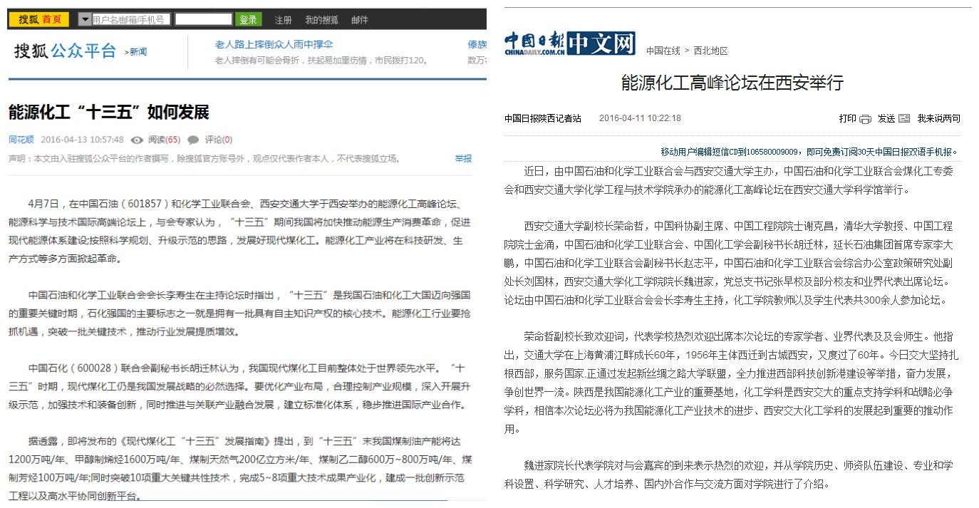 4月11日中国日报中文版报道了“能源化工高峰论坛在西安举行”的消息: