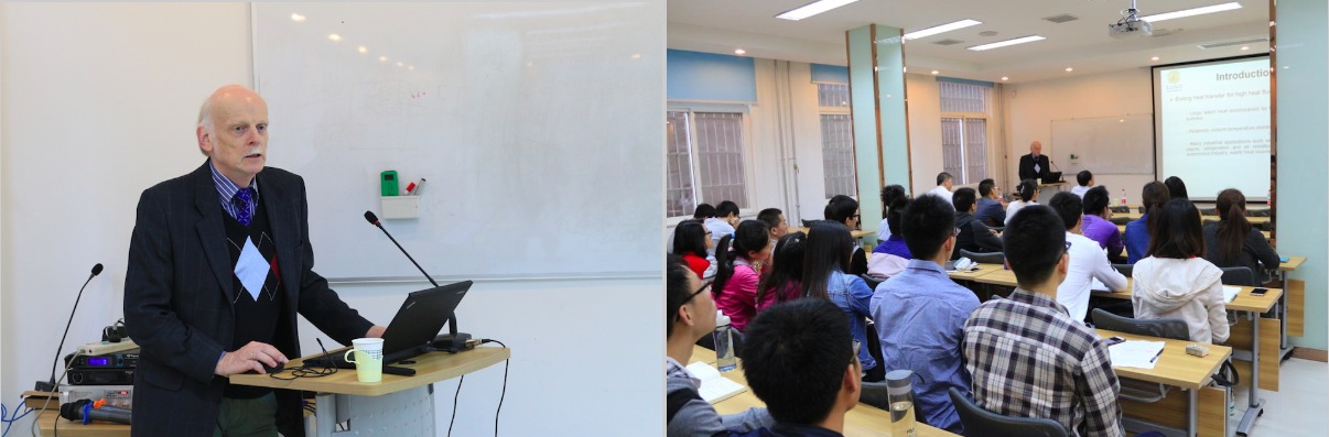 Bengt Sundén教授就表面微纳结构强化沸腾换热做了精彩的报告。首先,他介绍了影响沸腾换热沸腾起始点(ONB)、传热系数(HTC)及临界热流密度(CHF)的几个关键因素,阐述了Lund大学沸腾实验室在微纳结构表面池沸腾换热方面的研究进展,其中包括在光滑表面、翅片表面和波纹型表面沉积不同类型的纳米粒子、形成多孔介质以改变加热表面的润湿特性,从而提高沸腾换热性能。此外,Bengt Sundén教授课题组还研究了微结构表面管内流动沸腾的流型特征、压降特征以及相应关联式的建立。他通过若干例子阐明了传热表面结构和性质的调控对于沸腾换热强化的意义。最后,他对这一研究的前景作了展望,并指出其最终目标是为了开发下一代高效换热器。