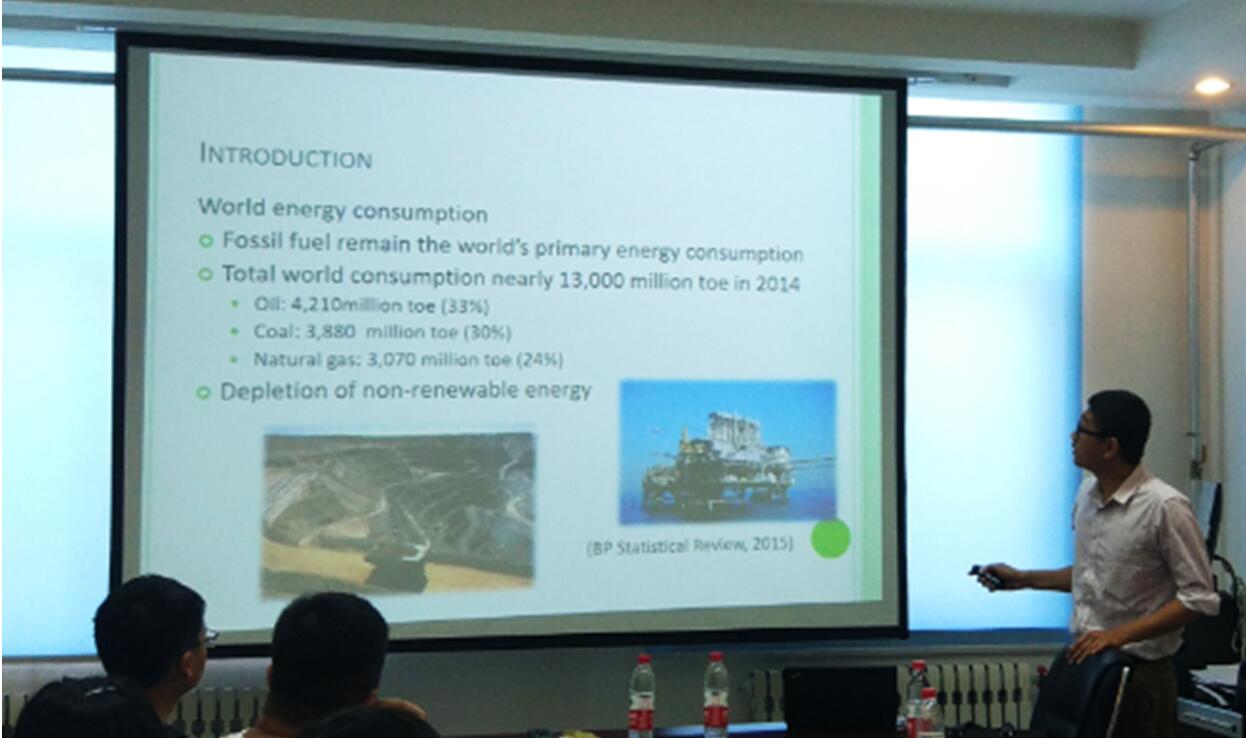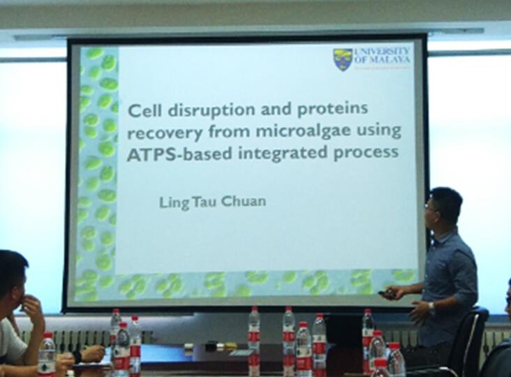 进行学术交流活动。访问期间Ling教授和Ong老师分别做出了题为“Integrated process recovery of proteins from microalgae ”和“The prospect and challenges of biofuel development”的学术报告。 Ling教授的报告主要讲述了微藻中蛋白纯化的方法,微藻是一类在陆地、海洋分布广泛,营养丰富、光合利用度高的自养植物,细胞代谢产生的多糖、蛋白质、色素等,使其在食品、医药、基因工程、液体燃料等领域具有很好的开发前景,但是其细胞壁厚、质地坚硬,不利于胞内蛋白的获取与纯化。ATPs溶液是纯化蛋白是一种较为新颖的方法,成功的将蛋白从微藻中纯化,过程简单方便且成本较低。Ong老师的报告主要讲述了生物燃料发展的前景与挑战,报告中主要强调了生物燃料生产过程中的重点与难点,密切联系当前生物能源现状,ong老师同时讲述了:从植物种子中提取油脂的优化方法,与传统的超临界萃取方法相比,成本更低,出油率也相对较高。