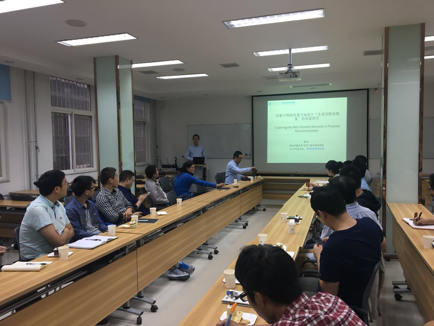 首先,陈飞老师做了题为“对高分子纳米复合体系中的“非爱因斯坦现象”的探索研究”的报告,他简要介绍了自己在“高分子纳米复合体系的复杂流变行为”方向上的一个研究设想,以抛砖引玉,引发大家的思考和交流。在场的青年教师纷纷踊跃发问,提出了各自的看法,并展开了激烈的讨论。