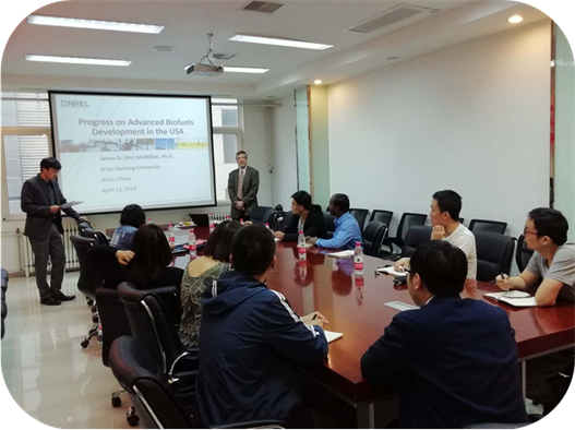 进行学术交流,并对西安交大化工学科建设与发展进行了指导和评价。McMillan教授一直从事纤维素生物炼制和海藻生物炼油等方面的研究及其工业化应用的推广。目前已在秸秆预处理、酶水解、纤维素糖发酵、生物能源及化学品生产等领域累计了25年实践经验。访问期间,McMillan教授做了题为:“Progress on Advanced Biofuels Development in the USA”的报告。McMillan教授的报告主要结合自己在生物燃料上多年研究的经验向我们讲述了美国先进生物燃料发展进展、生物燃料的价值及其生物燃料的转化路径等。作为美国国家可再生能源实验室首席工程师,McMillan教授就自己主要研究方向及相关研究的经历与91探花