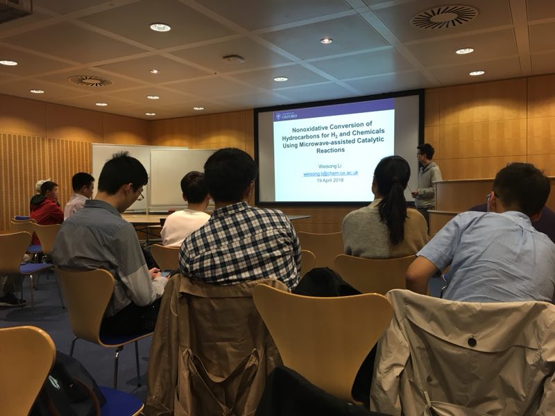 第二站,大家来到牛津大学化工实验室,参加了Peter院士和肖天存教授科研小组的组会。在Xiangyu Jie等三位优秀的博士生的讲解下,同学们既领略到了实验室里在未来清洁燃料-氢气制取研究的无穷魅力,还了解了现代化工对环境保护的贡献。更惊叹于各位博士生为了解决世界环境问题,以天下为己任的博大胸怀!