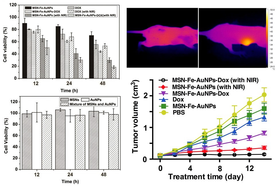 化疗是目前治疗癌症的主要手段之一,但是传统的化疗方法常常敌我不分,在杀伤癌症细胞的同时也杀伤了正常细胞,造成其治疗效率低下且毒副作用明显。因此,使用具有肿瘤靶向性和环境响应性的纳米药物载体改变传统化疗的给药方式,降低抗癌药物对正常组织的毒性,并结合多种新颖的治疗手段(如光热疗法,催化医学等)进行协同治疗,进而提高治疗效果,已经成为当前研究的一大热点。然而目前的光热治疗和催化医学依然缺乏选择性,如何降低治疗过程对体系周围健康组织的损害依然是多模式治疗有待解决的难题。