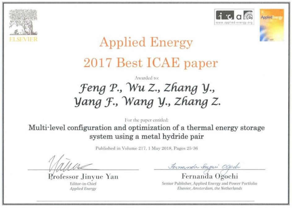 张早校教授指导的博士生冯鹏辉为第一作者的论文“Multi-level configuration and optimization of a thermal energy storage system using a metal hydride pair”被大会授予“Applied Energy Best Papers of ICAE2017”。这是张早校教授课题组第二次获得国际应用能源大会最佳论文。