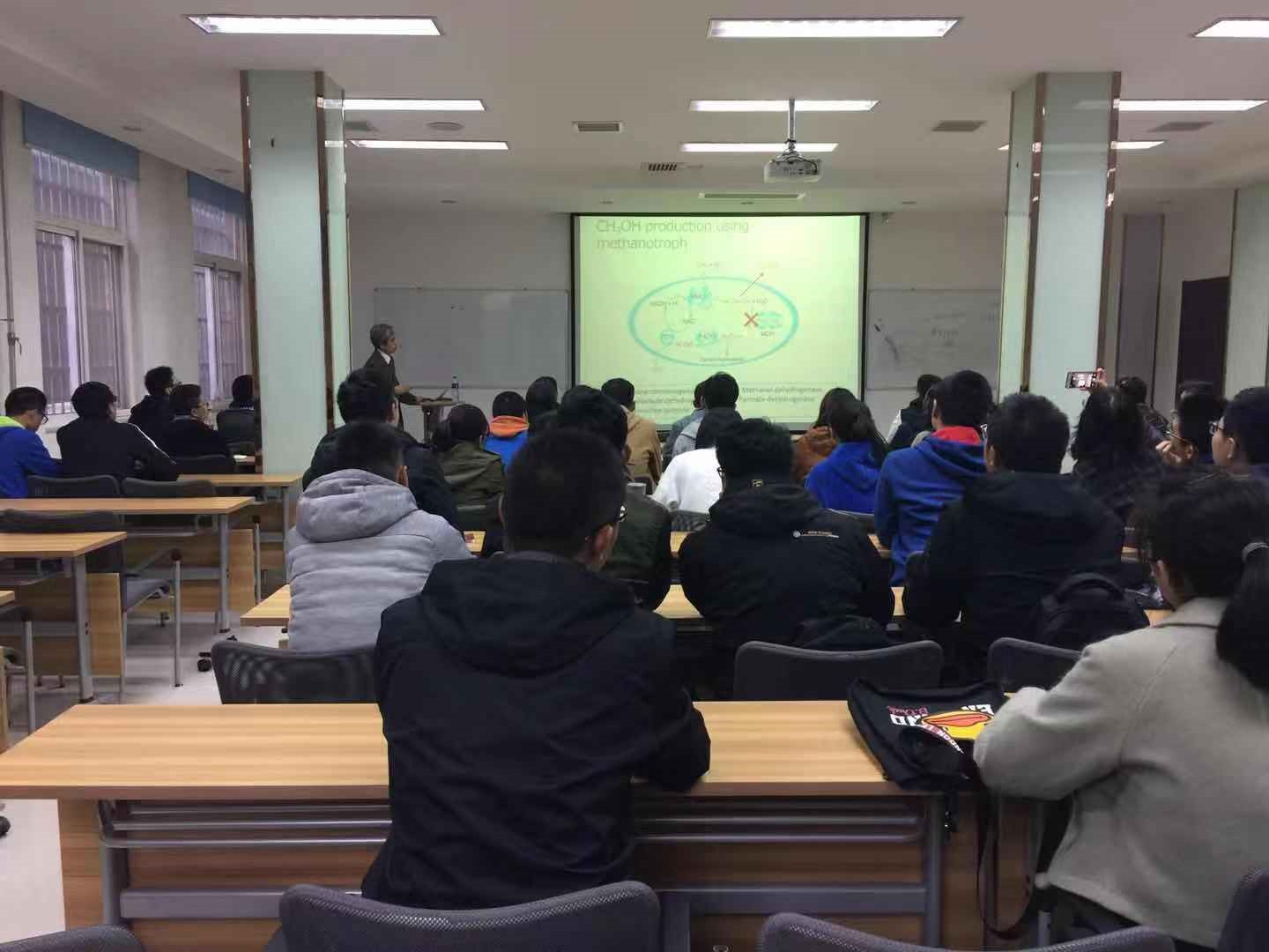 Toshiaki Kamachi教授目前从事生物化工方向研究,主要领域集中在生物无机化学、光化学及生物工程等。Kamachi教授在生物系统中金属离子功能研究以及金属蛋白的表征和应用方面取得一系列重要成果,已在JACS、Green Chemistry、Chem. Commun.等国际Top期刊发表高水平论文数十篇。访问期间,Kamachi教授分别做了两个主题报告。在“Introduction to Bioinorganic Chemistry”报告中,Kamachi教授首先为在场的研究生和本科生介绍了东京工业大学。作为日本理工科排名前三名的国际知名高校,Kamachi教授重点介绍了东工大在生物化工领域取得的各项研究成果,接着讲解了自己在生物无机化学方面的一系列研究和最新进展,并集中讨论了在生物系统中金属离子的多功能性以及金属离子在生物体内氧运输中的重要作用。在“Application of Metalloenzymes”报告中,Kamachi教授主要介绍了嗜甲烷菌转化来自于天然气和沼气的甲烷生物合成甲醇的主要机制,着重围绕代谢路径中的关键金属酶MMO展开讨论,Kamachi教授着眼于生物无机化学、光化学、及生物工程等多学科角度突破性的利用水作为电子供体,将后者成功的转移到Pmmo活性中心,极大程度地提高了该酶活性,继而促进了甲烷利用效率和甲醇的积累产率。Kamachi教授的研究成果与方向具有前瞻性和竞争性,对后期研究甲烷代谢过程中还原力的补给以及平衡策略具有关键作用,值得借鉴。