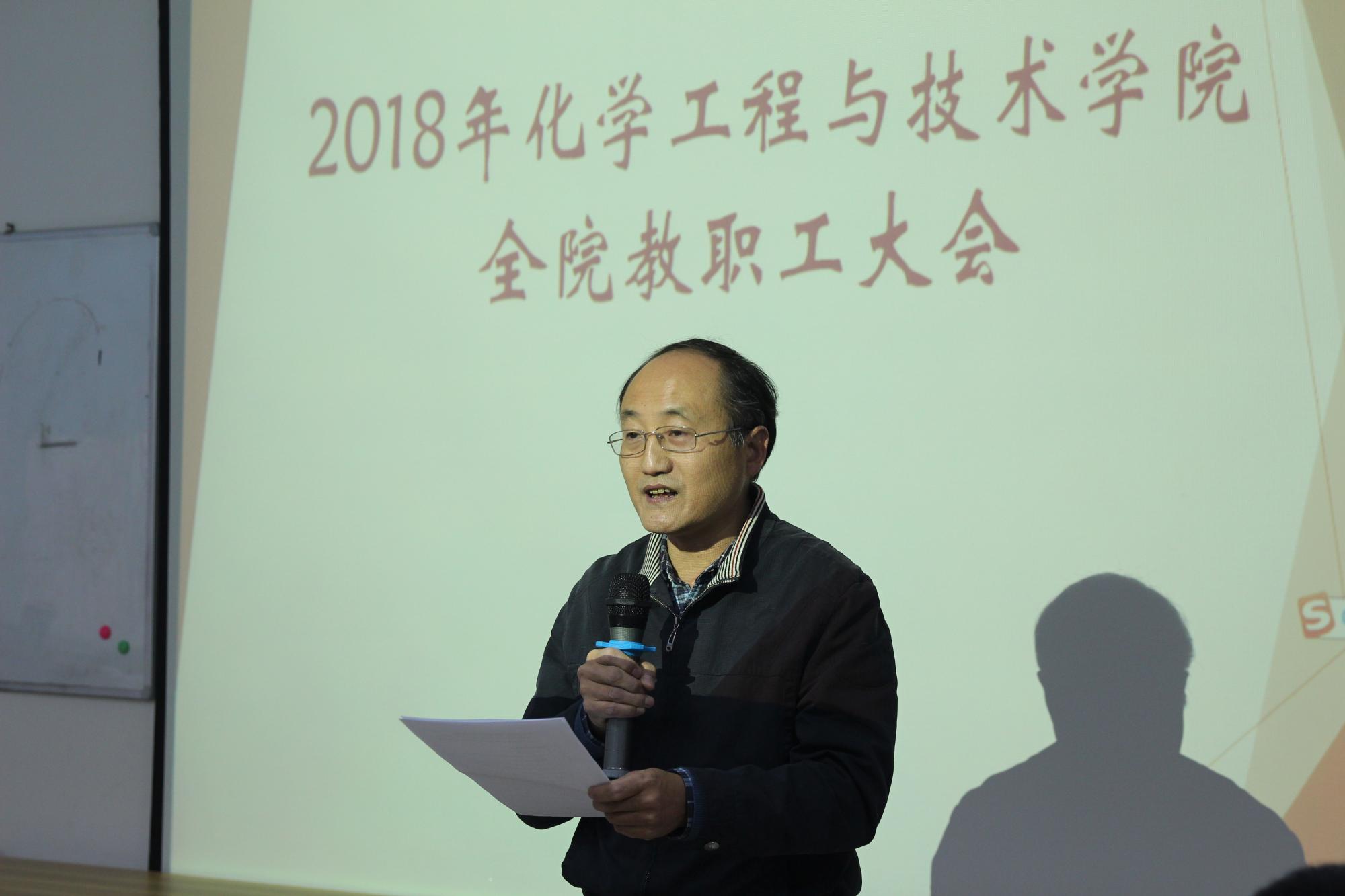 张早校做总结及动员讲话,号召全院教职员工在2019年要进一步解放思想,增强历史的紧迫感,紧跟时代,当好西迁新传人,为建设一流大学和一流化工学科不懈奋斗。