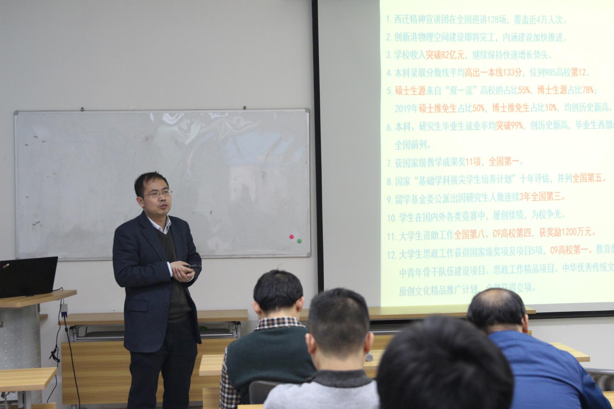 院长魏进家对王树国校长《历史的重大机遇 交大的使命担当》的报告进行解读,全面回顾了2018年学校在弘扬西迁精神、人才培养、科学研究、师资队伍建设、国际合作、服务社会、汇聚发展资源七个方面的主要工作及2019年学校的十项重点工作。