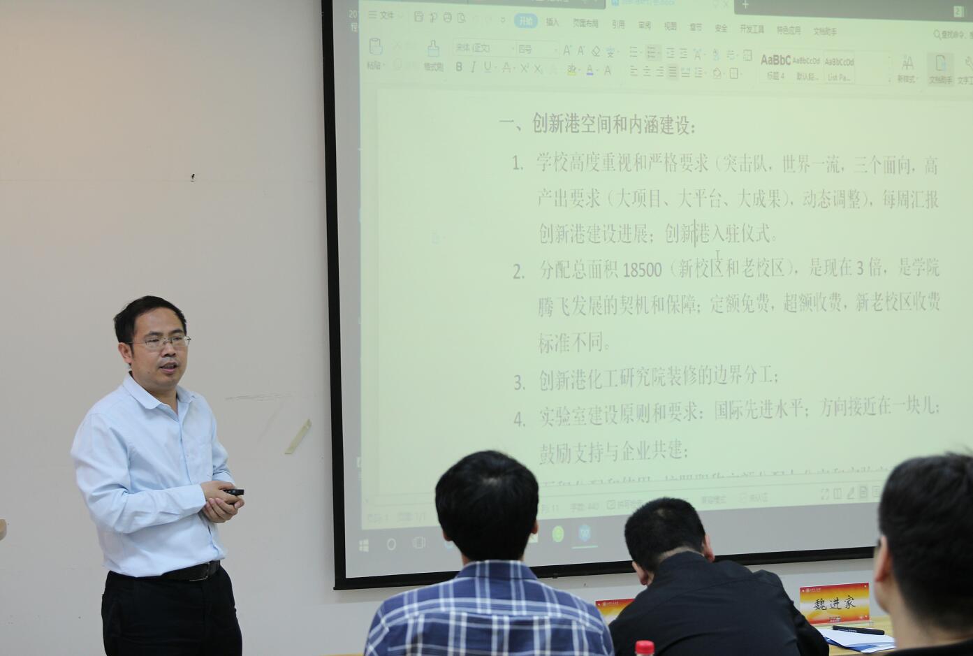 院长魏进家首先解读学校创新港建设工作要求和政策精神。他指出,学校对创新港物理空间和内涵建设高度重视并高标准要求,化工研究院是学院腾飞发展的难得契机和有力保障。实验室建设要以国际先进水平为标准,研究院体制机制要以“业绩为王、动态调整”为原则,希望全院教职工以时不我待、只争朝夕的姿态积极主动推进实验室规划和建设。