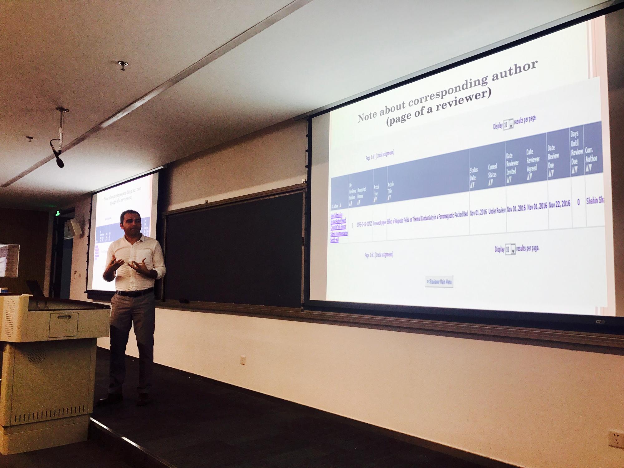 讲座首先从论文的类型开始谈起,概述了包括研究性论文、短讯、综述性论文、报告、书评、短评等不同类型论文的定义特征。接下来进一步介绍了一篇完整的论文应包含的结构以及各部分的撰写方法。在详细介绍各部分写作方法的过程中,Omid教授穿插推荐了许多实用的网站,可以帮助提高论文写作的速度和质量,例如使用google scholar或scopus查找相关论文有助于丰富引言的内容;在用英文写作的过程中,可以登录Grammarly网站,检查自己的语法是否正确;论文完成后登录ithenticate网站进行论文查重等。Omid教授作为《Energy》(Elsevier)期刊编辑委员会成员,《Journal of Thermal Analysis and Calorimetry》副主编以及70多个国际期刊的审稿人,在论文发表工作中具备丰富的经验。讲座下半场,他从期刊编辑的角度出发,详细解答了广大学生作为投稿人应该注意哪些问题,以及如何写出一封编辑喜欢的推荐信,如何确定推荐审稿人等。