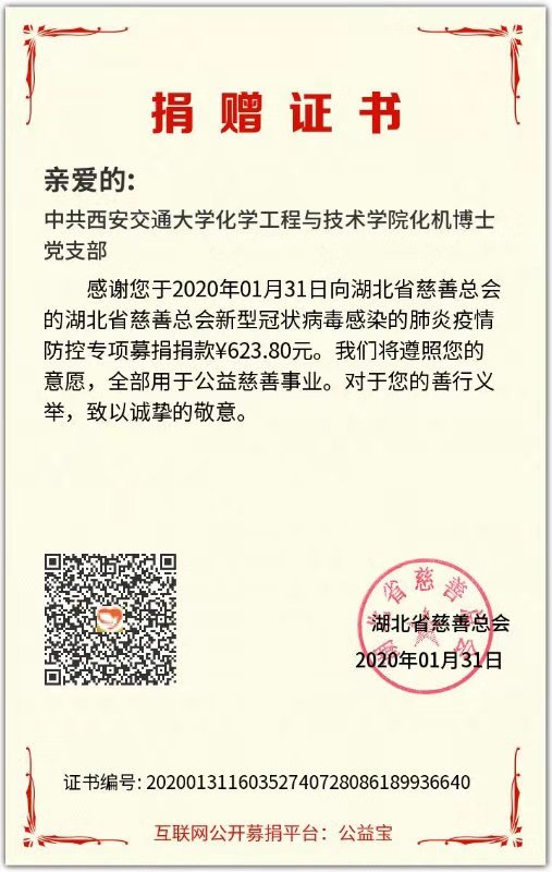 化机博士党支部向湖北省慈善总会新型冠状病毒感染的肺炎疫情防控专项募捐捐款623.8元,当天收到来自湖北省慈善总会颁发的电子版“捐赠证书”,湖北省慈善总会在证书中表示会遵照该支部意愿,将其全部用于公益慈善事业。捐款款项是该支部2018年度获得学校特色示范党支部的奖金支部开支结余金额。