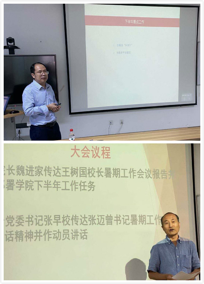 魏进家院长首先传达了王树国校长暑期工作会议上的重要讲话,介绍了学校上半年各项工作取得的成绩以及下半年学校重点工作,同时阐述了自己对于王校长在会议上关于未来大学发展的思考的理解。接着总结和梳理了学院2020年上半年各项工作取得的成绩和存在的问题,并对下半年学院各项工作进行了部署,特别是针对创新港平台建设和“科创月”活动再次进行了动员和部署。最后,他以“同心协力、共克时艰”勉励全院教职工,助力学院快速发展。
