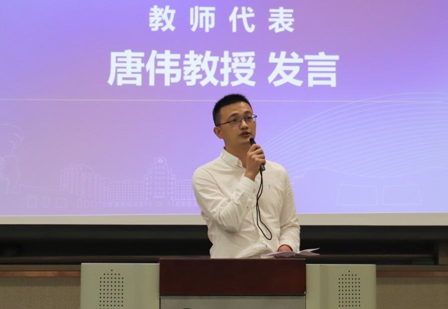 教师代表唐伟教授发言,首先他代表全体教师对各位同学的到来表示热烈的欢迎和由衷的祝贺。他表示科技创新关键在于人才,需要我们共同奋斗,他以交大校训与新生共勉,祝愿全体新生奋马扬蹄,不负韶华!