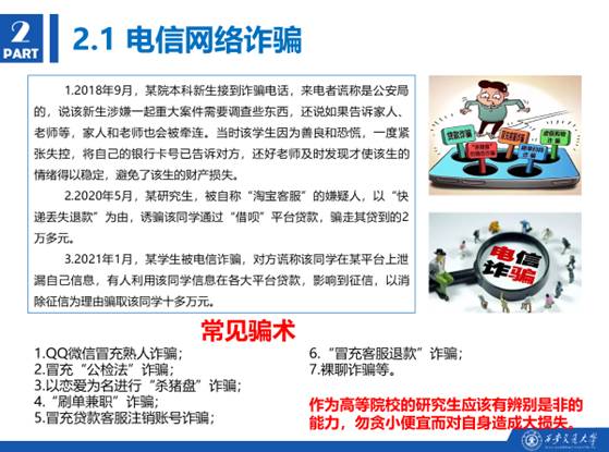 会议首先通过多个生动案例向同学们展示了身边常出现的安全隐患,包括实验室安全以及生活中遇到的安全问题,如:电信网络诈骗、节日外出旅游或探险意外、抢劫偷盗、交通伤害、传销受骗、宗教(邪教)渗透、实验室爆炸等案件;提醒同学们认识到日常生活中防患于未然的重要性和生命的脆弱与可贵,及时为同学敲响安全警钟。