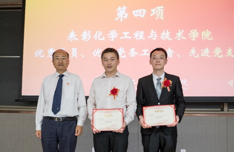两优一先表彰决定》。分党委书记张早校、党委委员杨贵东、党委委员陈飞分别为获得先进党支部、优秀党务工作者、优秀党员颁发证书。