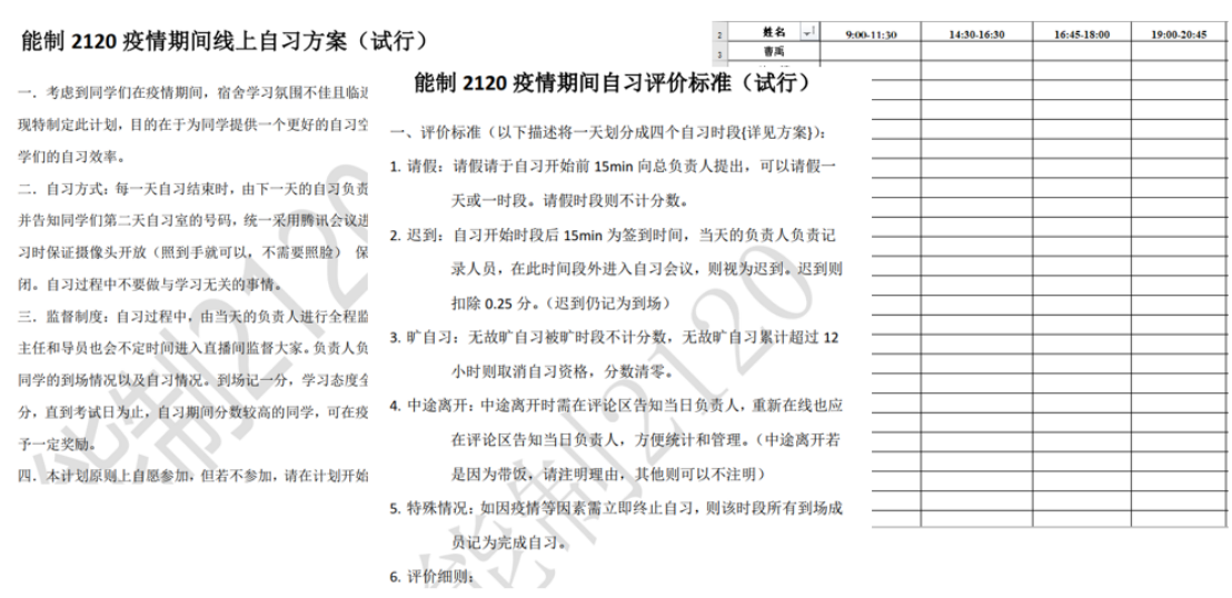 在班长宋航、学习委员刘智超等班委的快速组织下,《能制2120班线上自习方案》、《能制2120班线上自习活动评价标准》以及《能制2120班线上自习签到表》等制度文件于1月2日出台,能制2120班“线上自习室”也于1月3日正式营业。