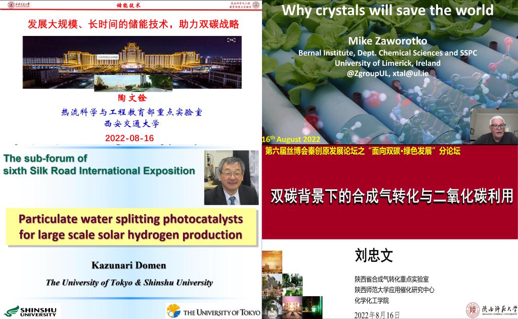 随后,陶文铨院士做了题为《发展大规模、长时间的储能技术,助力双碳战略》的特邀报告,分别从“储能技术的学科与应用分类、光热发电中的熔盐储能技术、光伏及风力发电的储能技术”等方面进行了介绍。爱尔兰科学院Michael Zaworotko院士做了题为《Why crystals will save the world》的特邀报告,分别从“晶体材料设计的历史背景、晶体材料设计首要原则、晶体材料在空气取水及直接捕集二氧化碳中的应用”等方面进行了介绍。日本东京大学Kazunari Domen教授做了题为《Particulate water splitting photocatalysts for large scale solar hydrogen production》的特邀报告,分别从“光催化剂设计、光催化反应器研发、光催化制氢系统建设”等方面进行了介绍。陕西师范大学刘忠文教授做了题为《双碳背景下的合成气转化与二氧化碳利用》的特邀报告,分别从“能源利用与双碳、双碳现状及进展、高碳资源的低碳化利用研究”等方面进行了介绍。