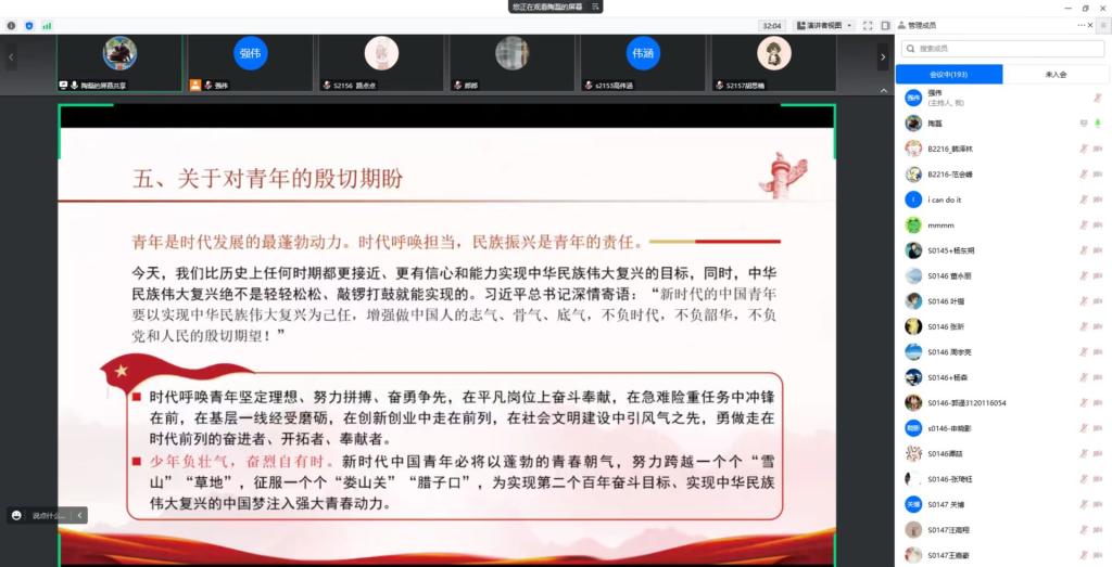 少年负壮气,奋烈自有时。新时代的中国青年生逢中华民族发展的最好时期,与新时代同向同行、砥砺奋斗,生逢盛世、责任在肩。陶磊鼓励全院青年同学在党的领导下以高昂饱满的姿态,奋进新征程,诠释新使命,创造新业绩,努力跨越一个个“雪山”“草地”,征服一个个“娄山关”“腊子口”,为实现第二个百年奋斗目标、实现中华民族伟大复兴的中国梦注入强大青春动力。