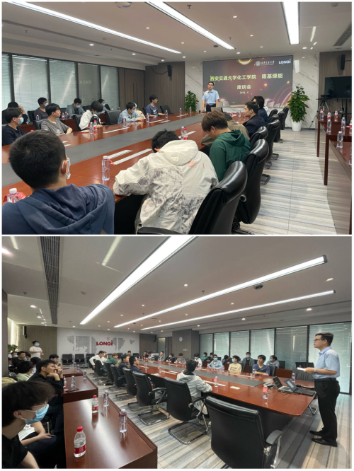 在随后的座谈交流环节,隆基绿能雇主品牌负责人周浩从中国双碳战略形成的背景、实现路径和难点出发,结合公司“绿电”+“绿氢”产品,为大家详细介绍了单晶硅片、电池组件、工商业分布式解决方案、绿色能源解决方案、氢能装备等五大业务板块,通过“稳健可靠,科技引领”的品牌定位,与大家一起分享了公司成功的原因。同学们通过积极参与互动提问,进一步加深了对企业的认识,拓宽了专业知识面,增加了专业认知。最后,周总还为大家介绍了工作岗位、面试流程、相关待遇以及晋升通道等信息,大一同学们主要就暑期实习询问了相关细节。
