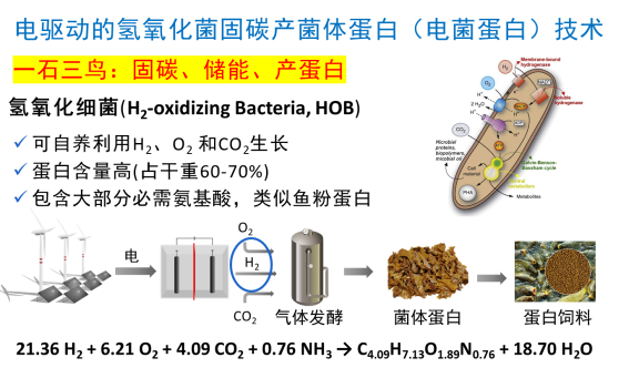 电能驱动的细菌固碳产单细胞蛋白技术(即“电菌蛋白技术”)是一种利用氢氧化菌将电解水产生的H2和O2用于固定CO2合成菌体单细胞蛋白的技术。该技术具有固碳、储能和产蛋白饲料的“一石三鸟”作用,对我国双碳战略和粮食安全具有重要意义。91探花