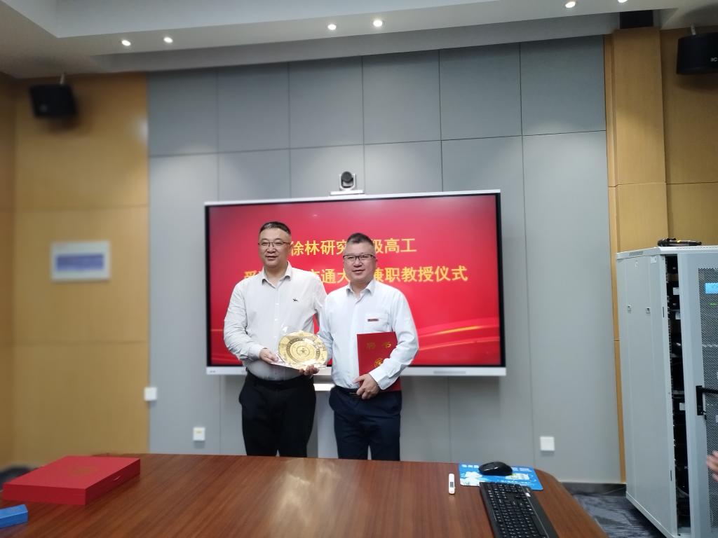 杨贵东院长宣读兼职教授受聘证书,为徐林高工颁发证书、佩戴校徽,并送上西安交大文创纪念品。