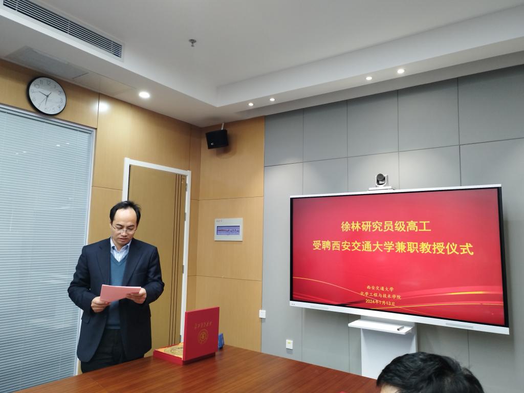 举办徐林研究员级高工兼职教授受聘仪式。宁夏瑞泰科技股份有限公司创新管理部副总经理石苏洋、宁夏瑞泰科技股份有限公司尼龙车间副主任王殿龙、西安交大技术转移中心副主任张晓、西安交大技术转移中心中卫分中心马涛、西安交大91探花