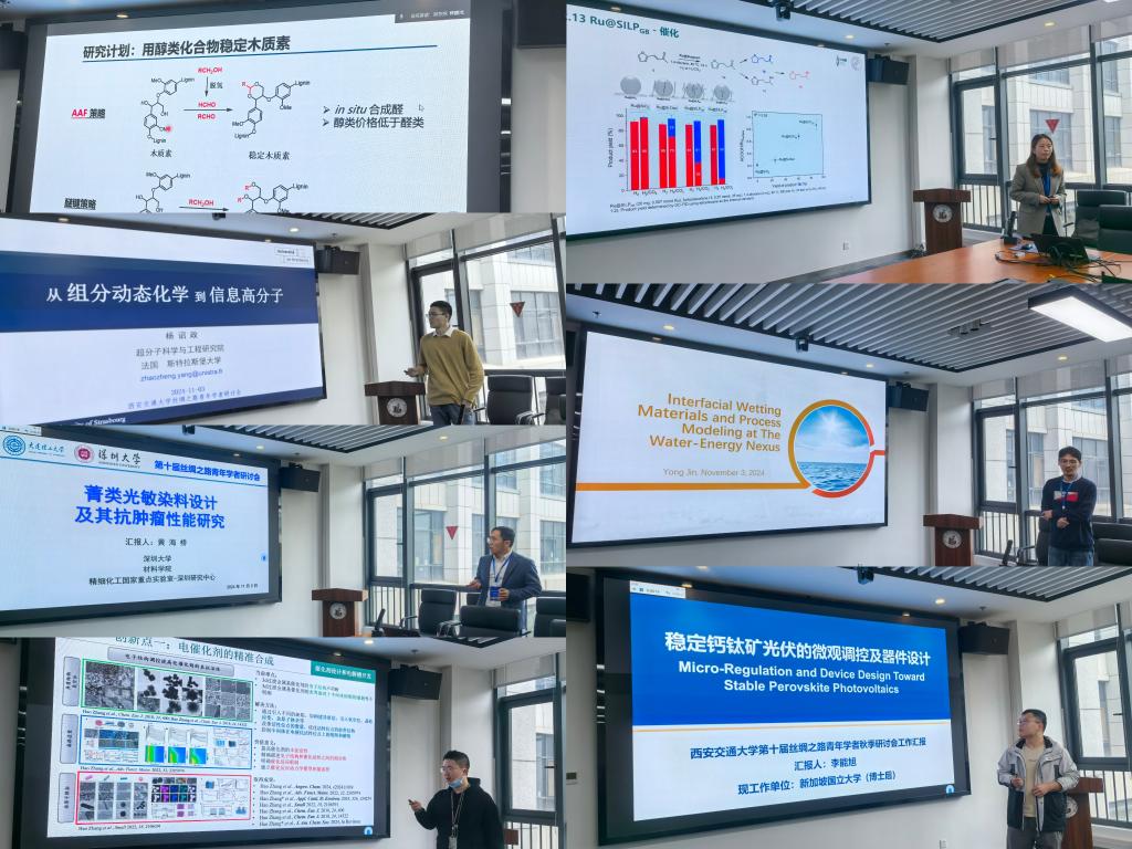 七位学者结合各自研究领域的工作依次做了精彩的学术报告,报告涉及可回收可降解的生活化学品、自适应催化体系、组分动态化学和有序高分子、界面浸润材料和过程模拟、光敏染料设计、电催化、钙钛矿光伏等多个具体研究方向,并分别与学院教师进行了深入的现场交流。