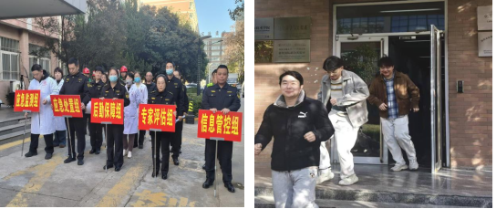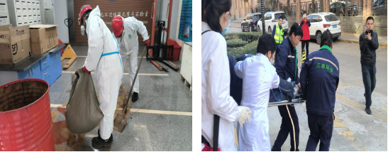 演练模拟危废转运过程中发生泄漏,伴有刺激性气体扩散并造成现场人员出现不适症状。接报后,朱臻立即启动应急预案,成立现场应急指挥部,学院组织师生疏散,保卫处迅速划定警戒区域,并立即请求西安市生态环境局碑林分局、碑林区消防救援队及新天地危废处置公司赶赴现场进行专业处置。