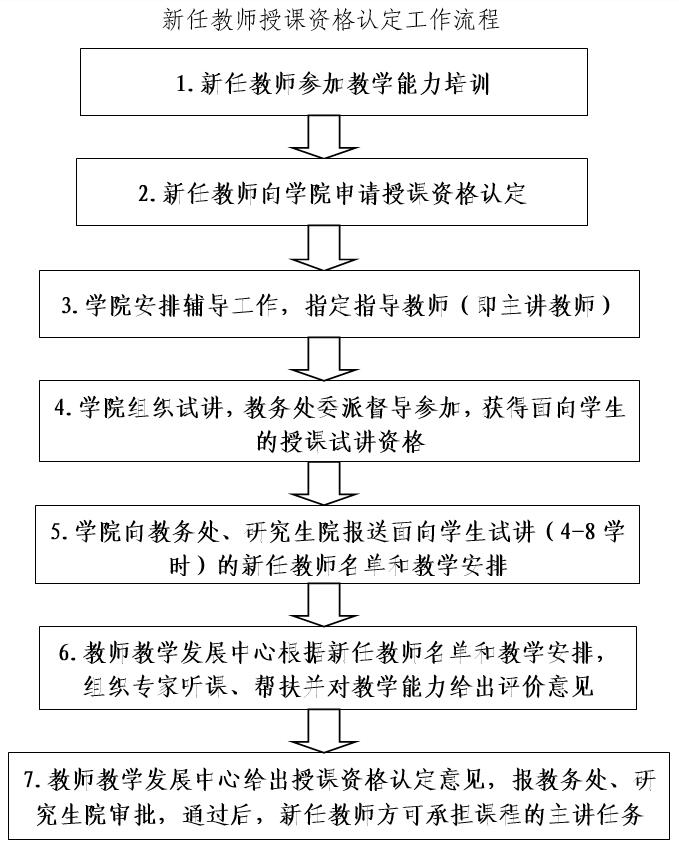 一、新教师授课资格认定主要步骤包括:新教师教学能力培训,授课辅导,院级试讲,学生试讲等环节。具体流程见下图: