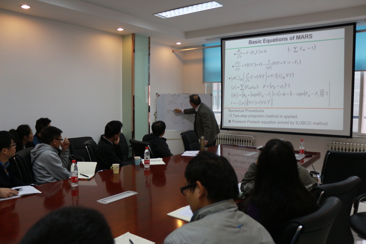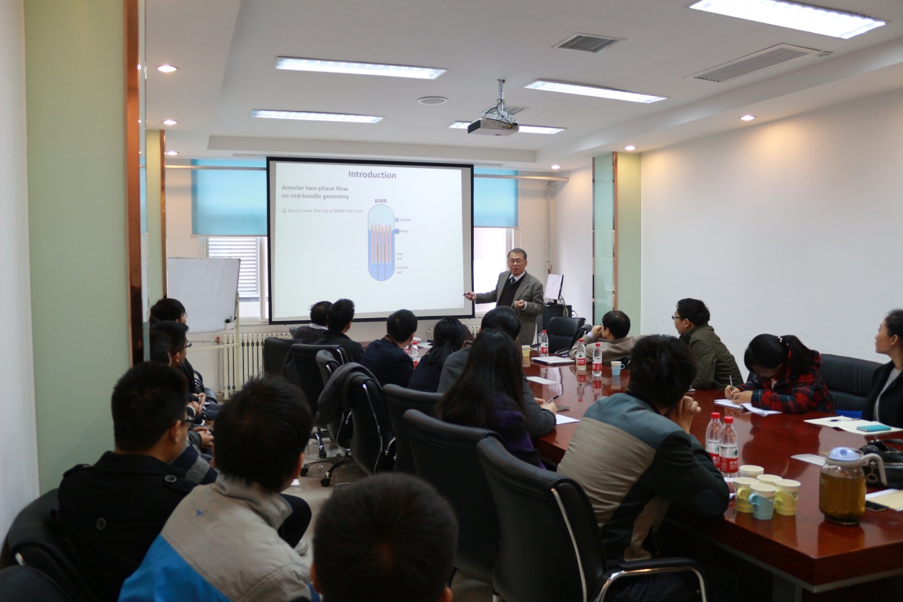 应91探花 副院长魏进家教授的邀请,日本京都大学教授Tomoaki Kunugi于2015年11月3日-7日来访我校,与91探花 师生进行学术交流。访问期间,Tomoaki Kunugi教授做了两个学术报告,介绍了他课题组关于核反应堆环状流中气液相界面与液滴夹带特性方面的研究以及沸腾现象的多尺度直接数值模拟研究。报告深入浅出,精彩纷呈。同时,我校师生也与Tomoaki Kunugi教授进行了深入的交流,从中受益匪浅。魏进家教授带领Tomoaki Kunugi教授参观了实验室,并对双方进一步的合作进行了详细探讨。