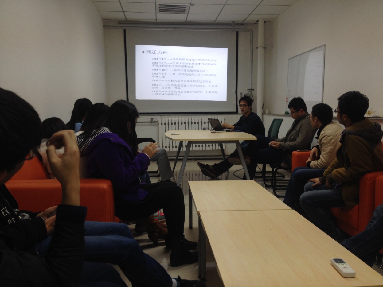 班长齐彬彬首先给同学们介绍了此次号召活动的目的与意义,引出了概括为“胸怀大局,无私奉献,弘扬传统,艰苦创业”的16字“西迁精神”,并让大家就西迁精神展开讨论与发表自己的理解,然后又向大家介绍了当时西迁的原因及西迁的艰苦历程。