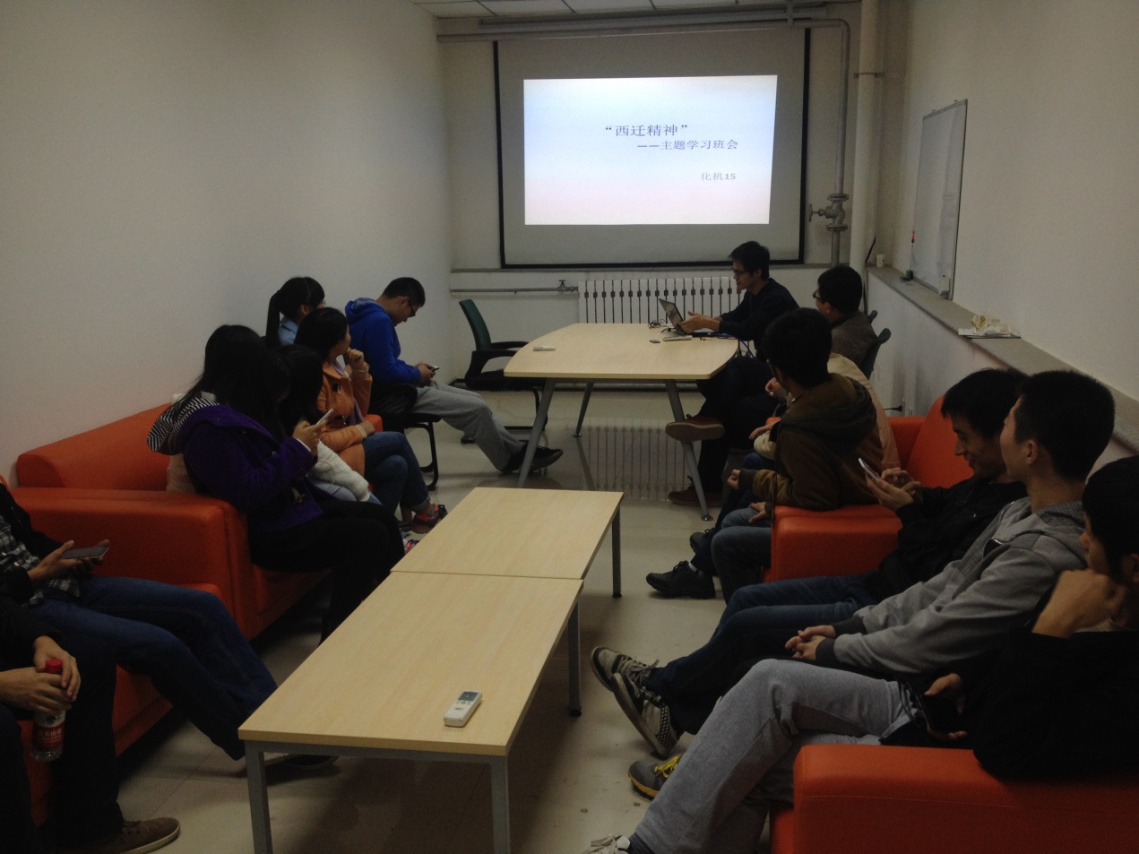 11月21日晚,化机15班积极响应学校党委进一步在全校学生中深入学习和践行“西迁精神”,引导广大青年学生弘扬交大传统,坚定理想信念,明确历史使命,凝心聚力,开拓创新,以更加奋发有为、昂扬向上的精神风貌, 将“个人梦”自觉融入到实现国家富强、民族复兴、人民幸福的“中国梦”进程之中的要求,在化工楼401会议室开展了以“学习西迁精神”为主题的班会,班会由班长齐彬彬主持,化机15班全体同学参加。