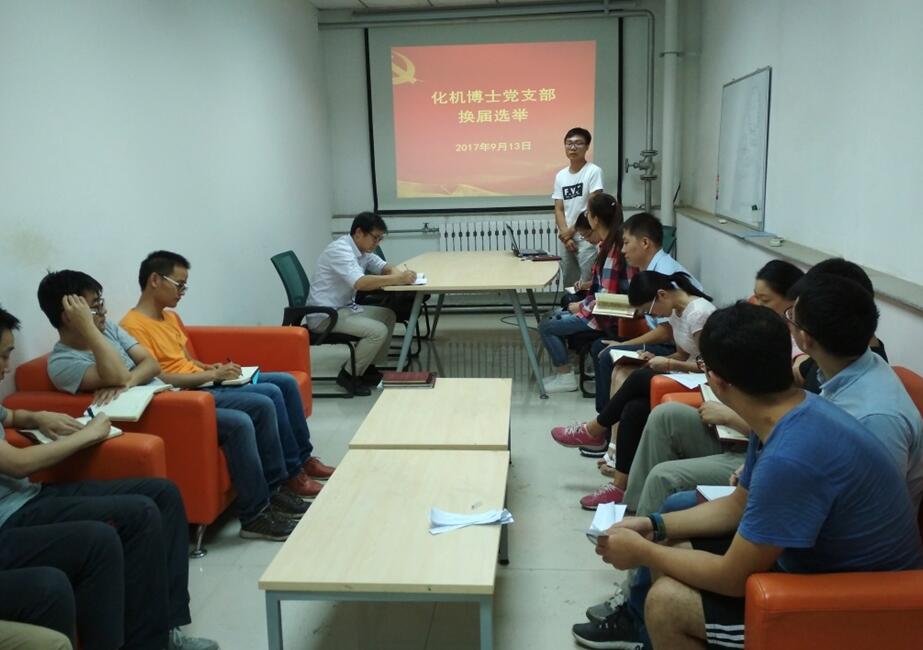 首先,支部书记对过去一年的支部工作进行了简要的总结。然后,报告了党员出席情况,支部应到党员18人,实到党员15人,宣布本次会议选举有效。介绍了党支部换届选举办法,选举办法获得了支部党员的一致同意。支部书记对三名支部委员候选人进行了介绍,全体党员对候选人进行了讨论。之后,全体党员对支部委员进行了投票,经过计票,支部书记宣布张洋、文孟刚、马莉三位同志当选为新一届化机博士党支部支部委员。最后,三名新当选的支部委员进行表态发言,三位同志均表态会尽心尽责、积极认真地做好党支部的各项工作。