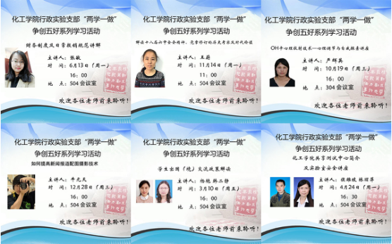 支部根据自身工作特点,面向全院师生推出一系列讲座活动,通过这一系列的活动进一步提高了行政教辅人员的服务意识。从2016年5月开始,我支部面向全院教职工开办了七次专项报告,解答了师生们关心的问题:(一)规范高效做好招标采购工作(二)财务制度及日常报销规范讲解(三)OH卡心理投射技术讲座——心理调节与自我探索(四)十八届六中全会精神解读及新版党章学习(五)如何提高新闻报道配图摄影技术(六)学生出国(境)交流政策解读宣讲会。(七)实验室安全培训。七次的专题报告意在解决教职工在日常工作中所经常遇到的棘手问题,让他们办事更清晰、更高效,把更多的时间和精力投入到教学科研中。