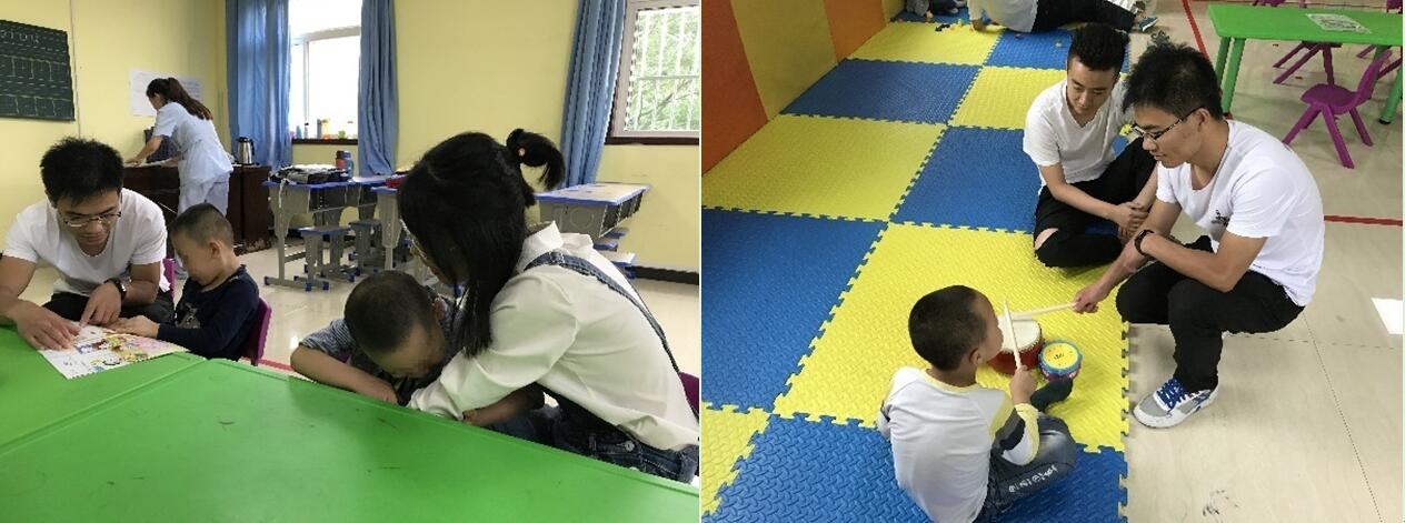刚开始,孩子们还是有些不安,但志愿者们的笑容很快就温暖了他们心。在康复中心老师的指导下,志愿者们先是需要协助小朋友识别画册上的动物和水果,教他们开口读出来,并练习造句。由于这些孩子的注意力难以集中,经常有小动作,表达能力也相对较差,需要多次进行耐心引导,反复让孩子们练习语言能力。然后帮助小朋友进行图形的识别练习,分辨不同形状的积木、塑料片和彩色纸片。课间休息时,志愿者们便陪着孩子们一起玩耍,与他们一起敲鼓、搭积木、转音乐盒、玩布偶……康复中心成了一片爱的海洋。快乐的时光总是格外短暂,很快便到了志愿服务结束的时间,志愿者在小朋友们有些含糊的“谢谢”和“再见”声中离开了教室。