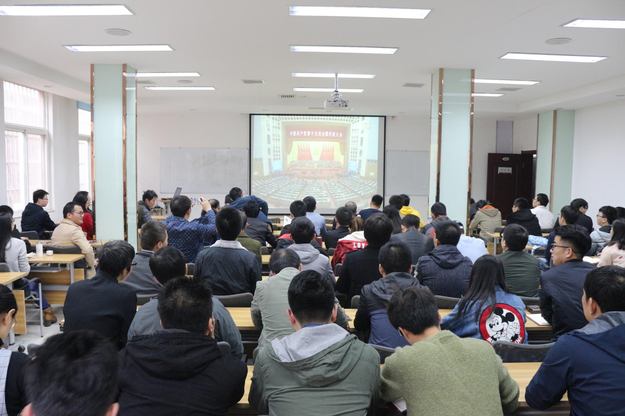 党总支组织全院师生党员在院办106会议室集体观看了党的第十九次全国代表大会开幕式,学院分党委委员及全体师生党员参会。