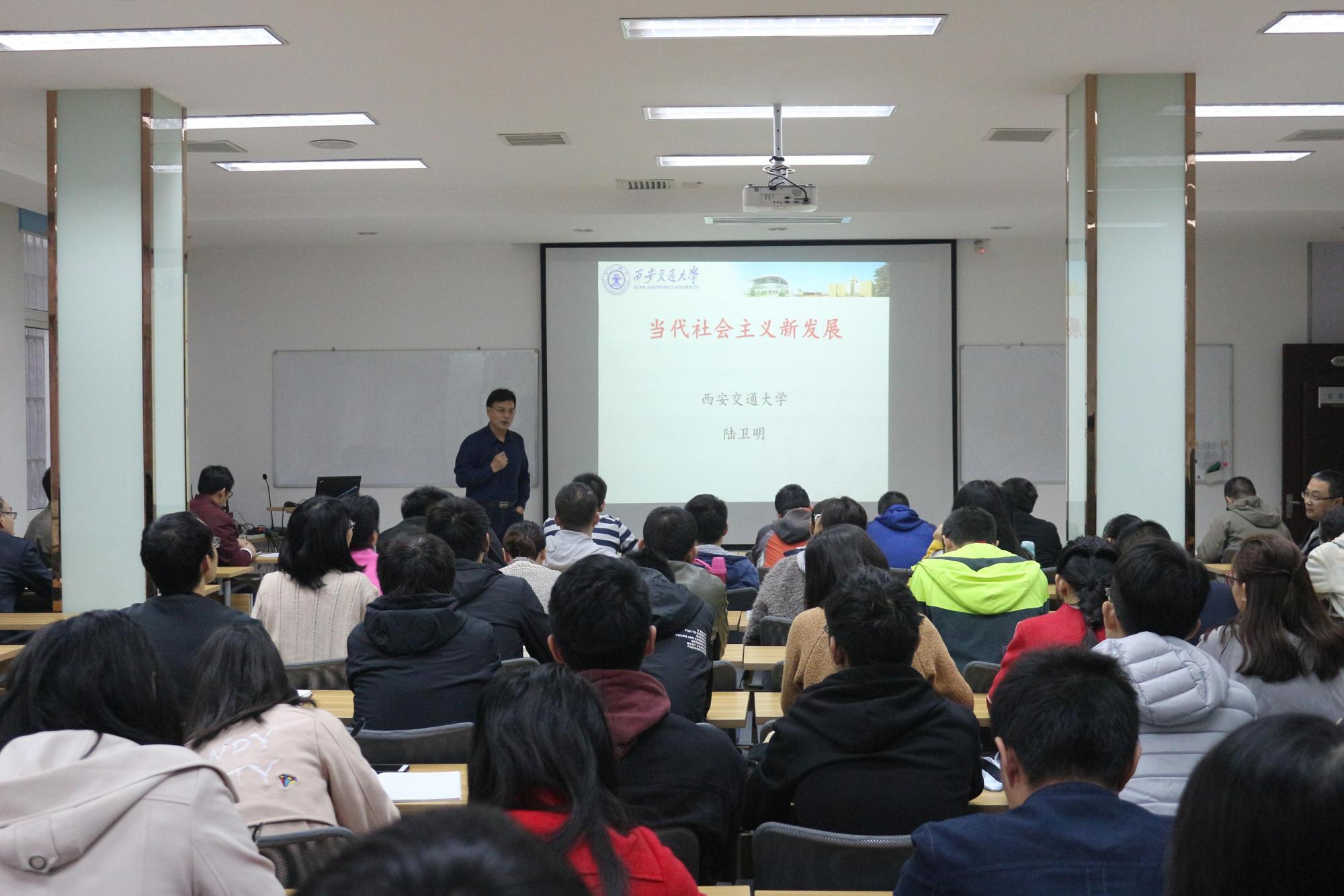 行政楼106会议室为全院师生党员做了《当代社会主义新发展》主题报告,副书记沈人杰主持,学院分党委委员、全体师生党员参会。