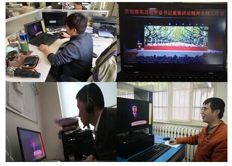 召开贯彻落实习近平总书记重要讲话精神全校工作会。化机系教工党支部组织党员在线观看直播。