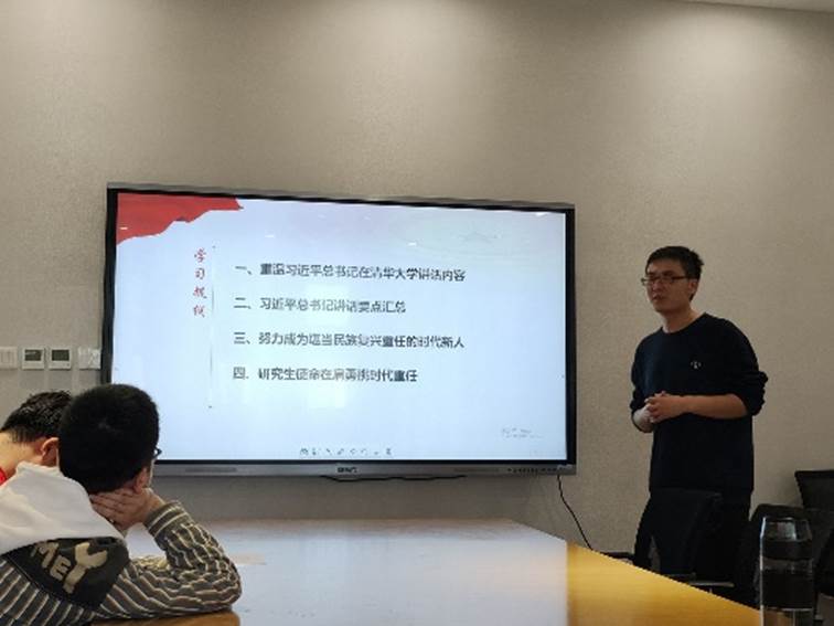 随后,9133党支部书记朱鹏飞为大家讲解了习近平总书记4月19日在清华大学发表的重要讲话,带领支部成员重温讲话内容,观看相关视频。朱鹏飞认为总书记的讲话对我们提出了四点要求,一是广大青年应树立爱国爱民之志,立志是成长成才之基;二是要锤炼品德,明德是成长成才之本;三是要勇于创新,创新是成长成才之要;四是要实学实干,务实是青年成长成才之需。在接下来的讨论中,申志远同志说;“我们研究生要贯彻总书记的讲话,最重要的就是要从解决卡脖子的问题入手,努力科研,真正从实际行动上为国家做贡献。”