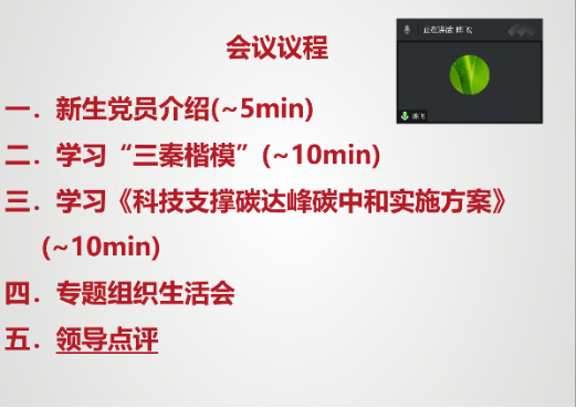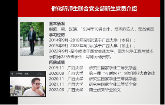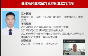 党委委员、副院长陈飞作总结发言。他首先向加入支部的三位同志表示欢迎,并期望他们在未来的工作和深造岗位进一步发挥模范带头作用。陈飞委员肯定了催化所各位党员同志在科研学习、支部建设等方面发挥的先锋模范带头作用并期待催化所的师生聚焦国家“双碳”目标,为“双碳”目标贡献交大力量。