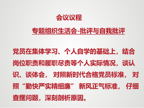 在“严守纪律轨迹、加强作风建设”专题组织生活会环节。教工党员在集体学习、个人自学的基础上,结合岗位职责和履职尽责等个人实际情况,谈认识、谈体会,对照新时代合格党员标准,对照“勤快严实精细廉”新风正气标准,仔细查摆问题,深刻剖析原因。各位教工党员按照要求依次发言,检讨自身在过去半年工作中存在的一些问题,并虚心接受其他同志提出的批评和建议。