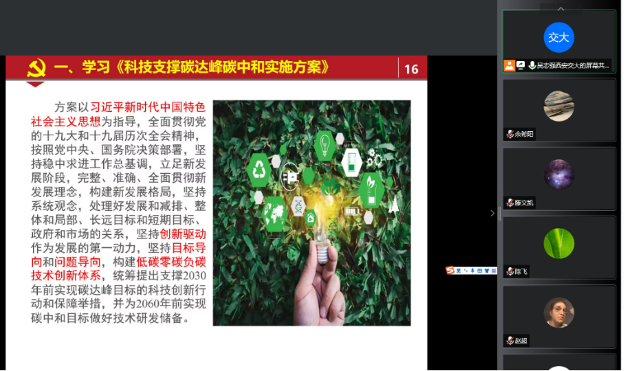 吴志强同志带领与会人员共同学习了《科技支撑碳达峰碳中和实施方案》。“碳达峰碳中和”是党中央经过深思熟虑作出的重大战略决策,事关中华民族永续发展和构建人类命运共同体。科技创新是同时实现经济社会发展和“碳达峰碳中和”的关键。化工人应该在能源绿色低碳、低碳与零碳工业流程、负碳及非二氧化碳温室气体减排、绿色低碳科技企业培育以及其他前沿颠覆性低碳技术创新上贡献自己的力量。