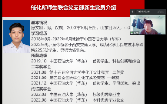 会议首先欢迎今年新加入支部的三位博士研究生党员,他们分别是滕文凯、郭秉荣和赵超。三位同志从个人基本情况、求学经历和科研情况等方面做了自我介绍。支部书记吴志强同志对三位同志加入支部表示欢迎,并寄语新生,期望他们脚踏实地,志存高远,以中国西部科技创新港为依托,在交大这个大舞台上为化工行业做出交大人的贡献。