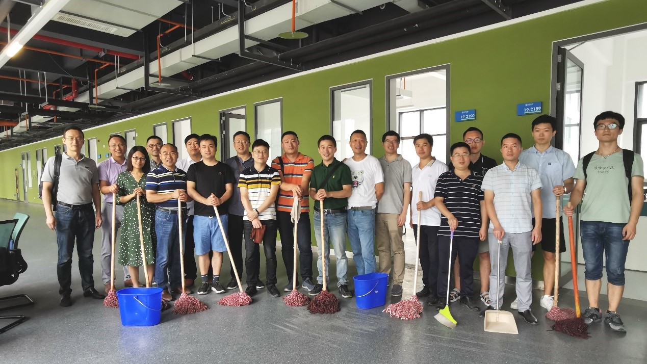 工会进行了深入的动员和细致的安排,事先为大家准备了拖把、抹布、扫帚、簸箕等劳动工具。为参加本次扫除活动,有的老师5点半起床,只为搭6:50的班车;有的老师干脆自己驱车前往创新港,都只为不错过任何一次与新家亲密接触的机会。劳动开始后,大家全情投入,干劲十足,相互协作,有的提水,有的拖地,有的擦桌子,对研究生工位和教职工办公室进行了认真打扫。