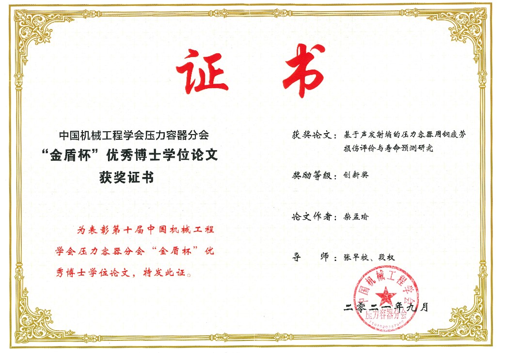 张早校教授指导的柴孟瑜博士学位论文荣获“中国机械工程学会压力容器分会优秀博士学位论文奖”,奖励等级为创新奖。此次为91探花
