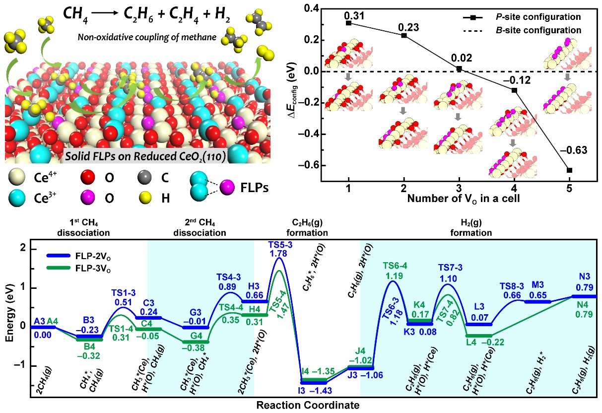 的常春然副教授课题组提出了在CeO2表面设计FLPs的策略,并将其应用于氢气活化和炔烃加氢反应过程,前期研究工作已发表在国际著名期刊Nat. Commun.(2017, 8, 15266, IF: 12.353)和ACS Catal.(2018, 8, 546−554, IF: 11.384)上。近日,该课题组通过理论计算,进一步提出动态FLP的概念,发现在一定的反应温度(> 700 K)和反应气氛下,表面FLPs可以动态形成,揭示了表面FLPs在真实催化过程中普遍存在的现象,并将其首次应用于甲烷无氧偶联制乙烷、乙烯和氢气重要反应过程。该研究成果近期以“Dynamic Frustrated Lewis Pairs on Ceria for Direct Nonoxidative Coupling of Methane”为题发表在国际权威催化期刊(ACS Catalysis,2019,9,5523-5536)上,影响因子为11.384。91探花