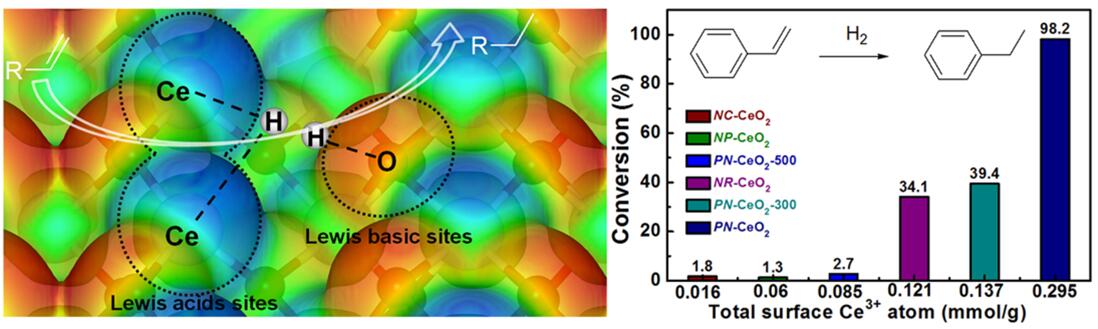 常春然副教授课题组与前沿院瞿永泉教授课题组合作,通过表面修饰工程在二氧化铈表面调控氧空穴,设计并制备出含FLPs活性位的全固相催化剂。这种特殊的活性位点由两个相邻的铈原子(Lewis酸)和氧空位相邻的一个氧原子(Lewis碱)组成。经理论和实验证实该类固体FLP催化剂对氢气分子的解离活化以及不饱和烃的加氢具有近贵金属催化剂的活性。以上通过调控氧空穴构筑固体FLP催化剂的理论基础明确,制备工艺简单,对开发其它固体氧化物基的多相FLP催化剂具有普适性指导意义。以上研究结果于5月18号发表在在国际知名期刊Nature Communications上(2016年影响因子11.33),91探花