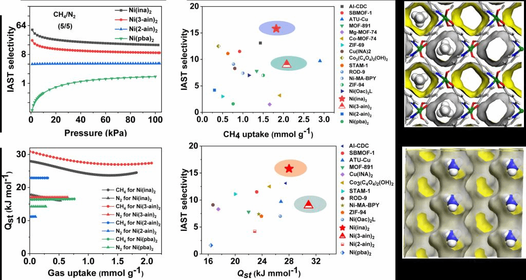 杨庆远教授课题组研发了系列镍基-金属有机框架(MOF)材料,其中超微孔MOF材料Ni(ina)2具有甲烷/氮气选择性高(15.8)、吸附容量大(46.7 cm3/g)和分子扩散速率快(10.6-19.0 cm3g-1s-1)的特点,较好地解决了气体分离领域的“trade-off”效应,实现了煤层气中甲烷和氮气的高效分离。理论模拟计算和单晶结构解析表明Ni(ina)2和甲烷分子之间存在较强的作用力,可以从低浓度煤层气中选择性地捕获甲烷分子。另外,Ni(ina)2具有很好的热稳定性和化学稳定性,可以批量化制备,是一种理想的固体吸附剂,该工作为工业上煤层气的分离提供了新思路。