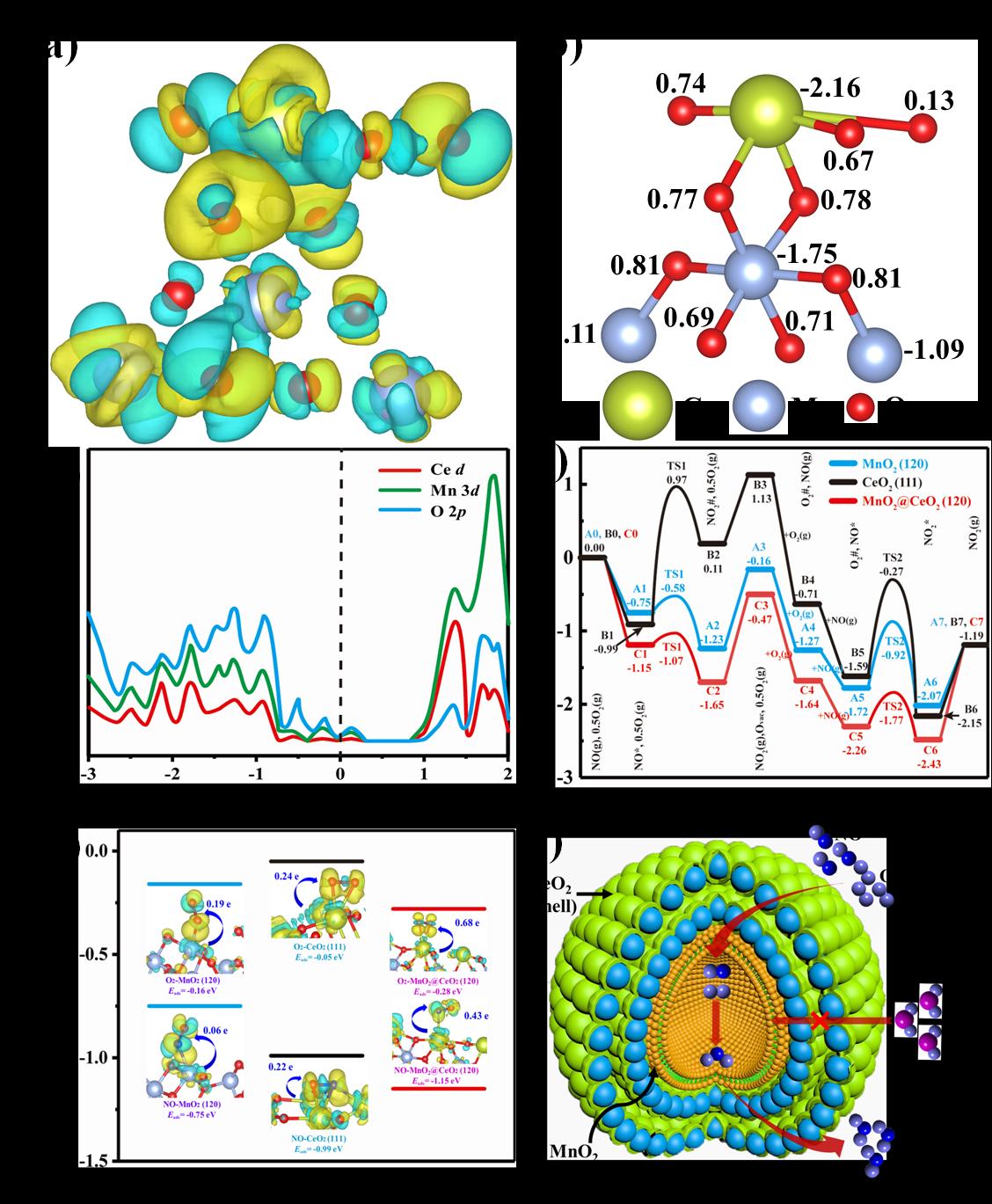 图4.(a,b)电子定域函数、(c)态密度、(d)一氧化氮氧化势能图、(e)催化剂上的吸附模型、(F)提出的中空核壳锰铈催化剂上一氧化氮氧化反应机理示意图