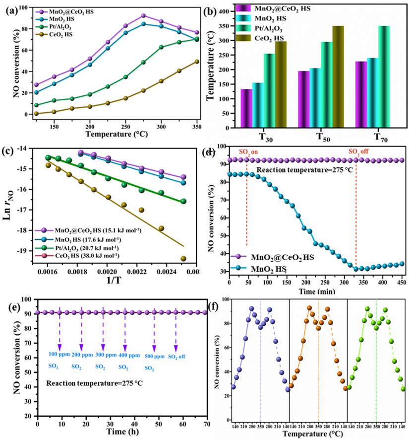 图2. 不同样品的(a,b)脱硝效率与反应温度的关系。(c) 阿伦尼乌斯方程。(d,e)中空二氧化锰和中空核壳锰铈催化剂在二氧化硫存在下脱硝效率随时间的变化曲线。(F)中空核壳锰铈催化剂的稳定性测试