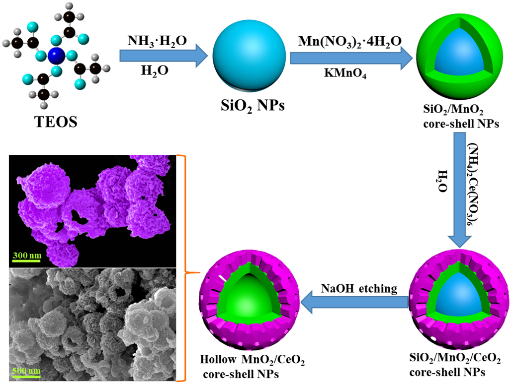 博士后陈磊受到中空核壳结构纳米材料的启发,设计了中空核壳锰铈催化剂(图1)。该催化剂将二氧化铈引入到二氧化锰外表面,形成层次化结构的中空核壳锰铈催化剂,该介孔结构为有效传质提供了可能,从而提高了热催化性能。